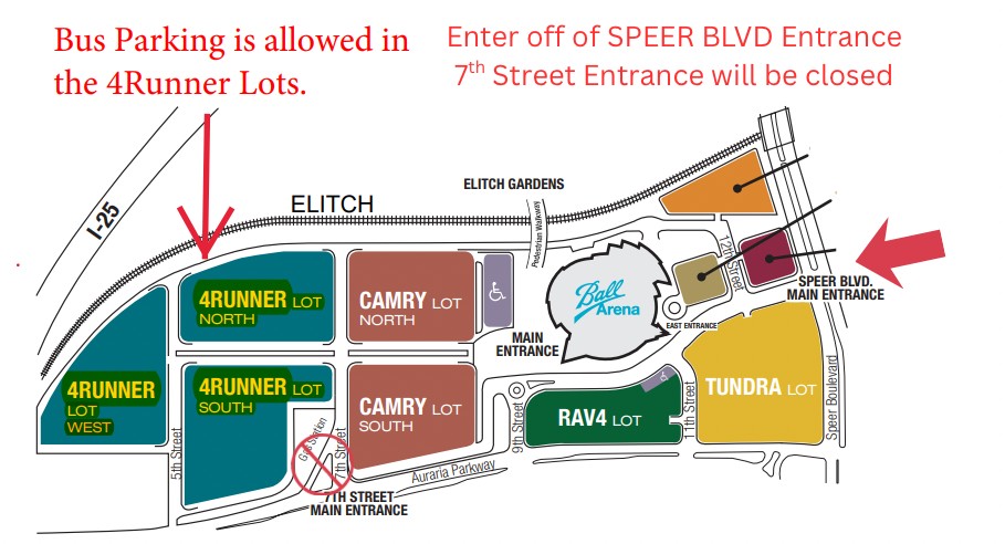 Bus Parking will be in the 4Runner Lots at Ball Arena (formerly the Pepsi Center). **Please note: The 7th Street entrance to Ball Arena will be closed – buses will have to go around to Speer Blvd. and use the main entrance bringing them to 12th Street and Chopper Circle, then follow the map to reach the 4Runner Lots.** Buses must leave the 4Runner lots by 4:00pm – at that point, they can wait on the south side of the circle in front of the King Center for their students.